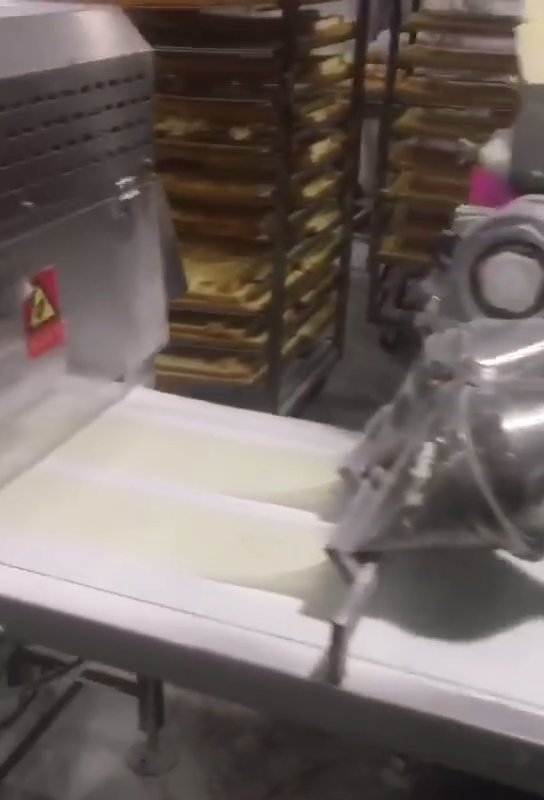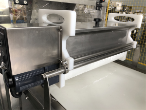 Cutting conveyor is a 4m conveyor with Two dusting device + one Cutting device, to cut mochi to small pieces and prevent it stick on conveyor, special designed for Taro, Mochi cutting, Rice cake…